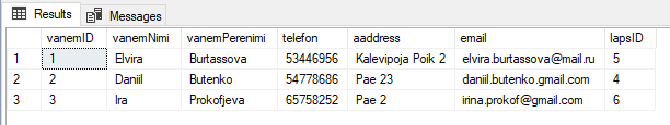 INSERT INTO vanem (vanemNimi, vanemPerenimi, telefon, aaddress, email, lapsID)
