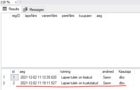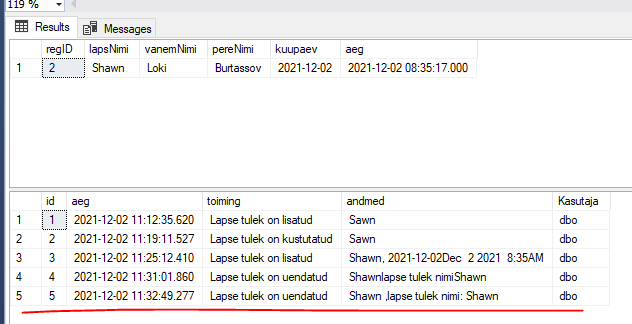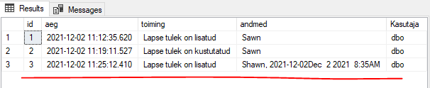 SELECT GETDATE(), 'Lapse tulek on lisatud', inserted.lapsNimi, USER