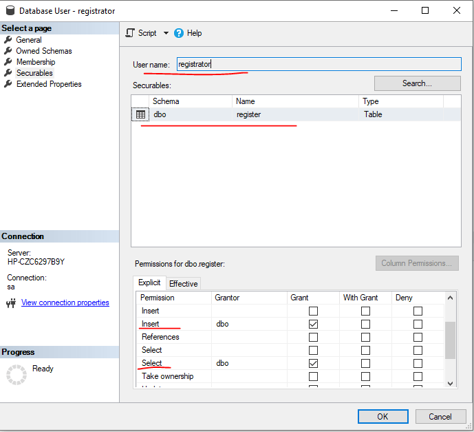 GRANT SELECT, INSERT ON register TO registrator