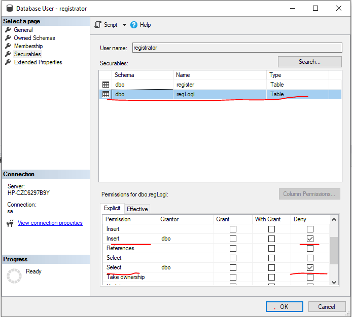 DENY SELECT, INSERT ON regLogi TO registrator