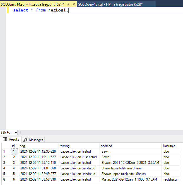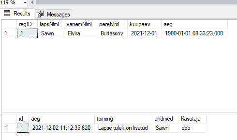 SELECT GETDATE(), 'Lapse tulek on lisatud',